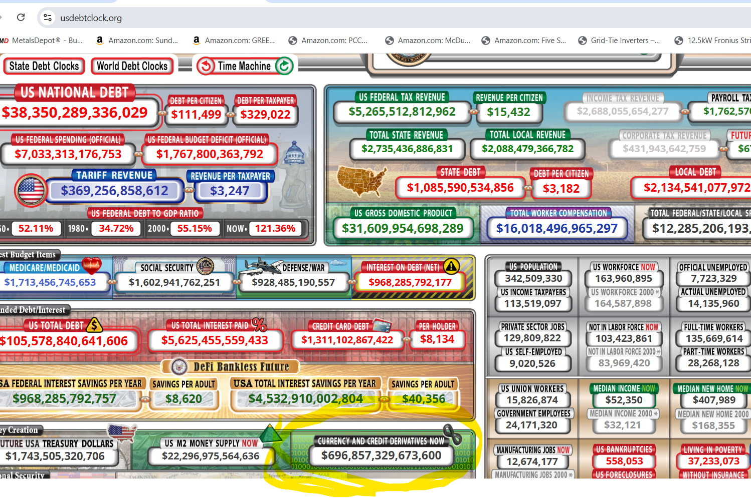 WE ARE ROUGHLY 3 billion more people on earth today than in the year 2000. in this USA our employees have added roughly from less than one trillion dollars in 2000 to now over 692 trillion dollars in currency and credit derivatives. OR MORE BLUNTLY; if you had one dollar in 2000/ that one dollar has been multiplied by NOW THERE ARE 692 more dollars being used by someone; who is not you. To compete with you; and “your dollar”/ which is now worthless; because our employees stole its value/ while media distracted you with worthless information claiming “tiny inflation” instead. While never once acknowledging the debt of this nation is over 110 trillion dollars. Never once admitting: the math is one trillion dollars is equal to ten thousand dollars per each one of one hundred million workers. Go search for truth/ DON’T believe “university knows”. they lie, steal, betray, and terrorize; changing whatever they want into media propaganda!